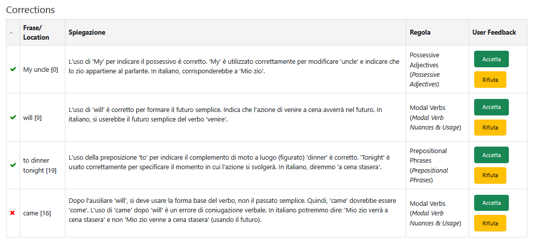 Il sistema individua l'errore specifico e ti rimanda alla regola esatta (colonna "Regola") da ripassare.