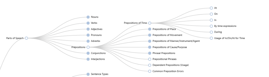 Qui sotto puoi vedere come il nostro sistema "ragiona": parte dalle macro-categorie (come le "Parti del Discorso") e scende in profondità fino al singolo dettaglio (ad esempio, l'uso specifico di "At", "On" o "In" nelle preposizioni di tempo).